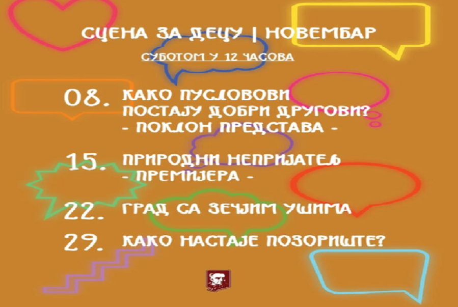 Pozorište „Dobrica Milutinović“ tokom novembra priprema bogat program za najmlađu publiku u okviru ciklusa „Scena za decu“. Predstave će se igrati svake subote u 12 časova, a mališani će imati priliku da uživaju u zabavnim i poučnim pričama.