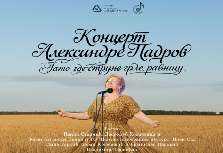 Centar za kulturu „Sirmijumart“ i Udruženje „Tradicionalna nota” pozivaju vas u noć posvećenu muzici zavičaja. U četvrtak, 27. novembra, od 19 časova, u sali Pozorišta „Dobrica Milutinović” zapevaćemo uz Aleksandru Padrov – „Tamo gde strune grle ravnicu”.