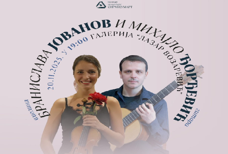 Centar za kulturu „Sirmijumart“ poziva vas na koncert Branislave Jovanov (violina) i Mihajla Đorđevića (gitara), koji će biti održan u četvrtak 20. novembra, od 19 sati u Galeriji „Lazar Vozarević“.