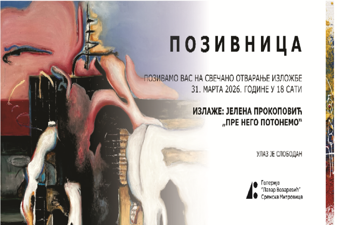 Galerija „Lazar Vozarević“ sa ponosom najavljuje otvaranje samostalne izložbe slika akademske umetnice Jelene Prokopović, pod nazivom „Pre nego potonemo“. Svečano otvaranje je zakazano za utorak, 31. marta, sa početkom u 18:00 časova.