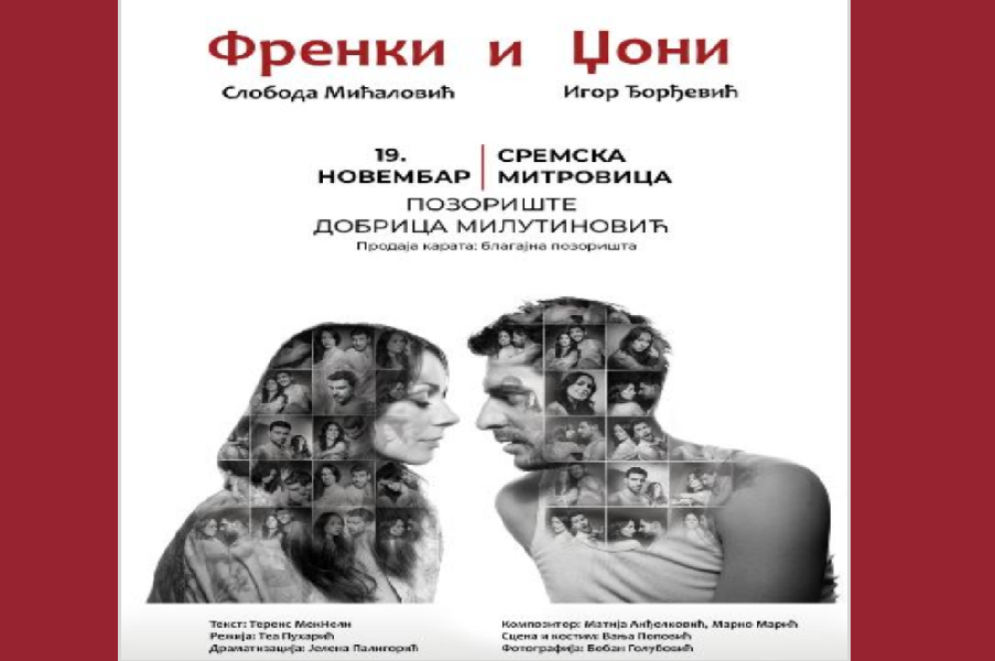 Pozorišna predstava pod nazivom „FRENKI I DŽONI“ odigraće se u Velikoj sali mitrovačkog Pozorišta u sredu, 19. novembra, sa početkom od 20 časova. U predstavi igraju Sloboda Mićalović i Igor Đorđević.