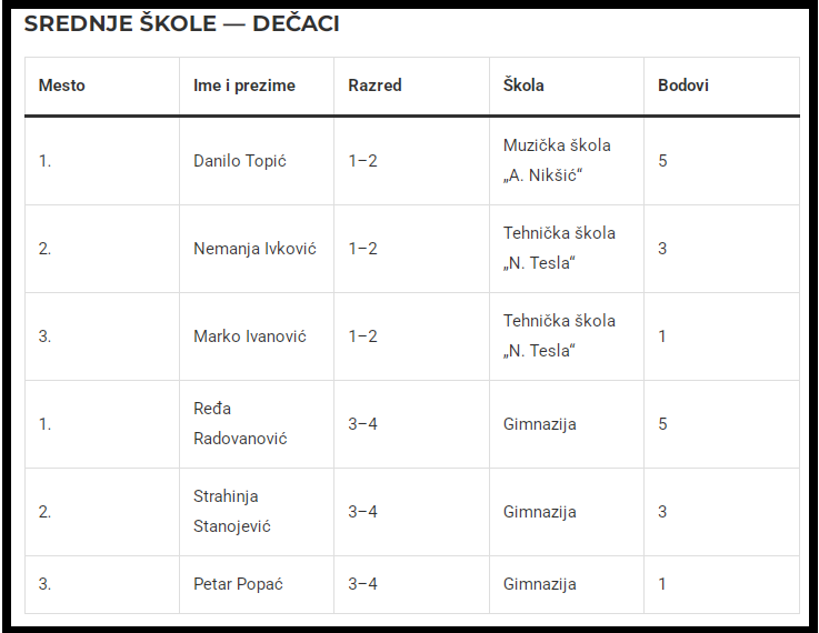 Ukupni pobednici po školama: