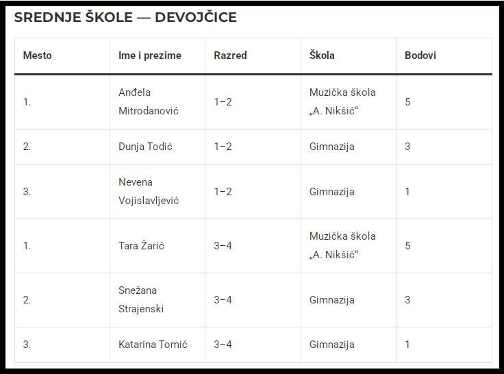 Srednje škole — devojčice: Muzička škola Draginja Nikšić