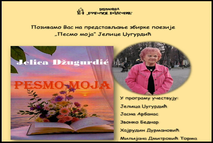 U četvrtak 4. decembra, u 18 sati, u Biblioteci „Gligorije Vozarović“, održaće se promocija knjige „Pesmo moja“ naše sugrađanke Jelice Džugurdić.