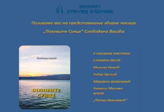 U četvrtak, 5. marta, u 18 časova, u Biblioteci „Gligorije Vozarović“ u Sremskoj Mitrovici biće predstavljena nova zbirka pesama „Pozovite sunce“ zavičajnog autora Slobodana Vasića. O zbirci će, pored autora, govoriti Milica Uverić, direktorka Srpske čitaonice u Irigu, koja je izdavač ovog dela, kao i Todor Bjelkić, urednik i recenzent.