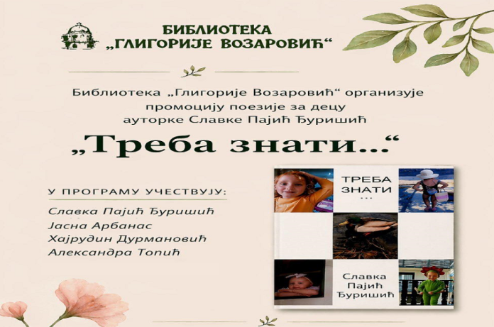 Promocija nove knjige pesama za decu „Treba znati“ Slavke Pajić Đurišić. održaće se u Čitaonici mitrovačke Biblioteke „Gligorije Vozarević“, u utorak, 28. aprila, sa početkom u 19 časova.