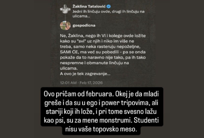 Objava novinarke Žakline Tatalović na mreži X izazvala je burne reakcije u javnosti, nakon što je ukazala na, kako tvrdi, opasnu dinamiku u kojoj se mladi ljudi guraju u prve redove društvenih i političkih sukoba.