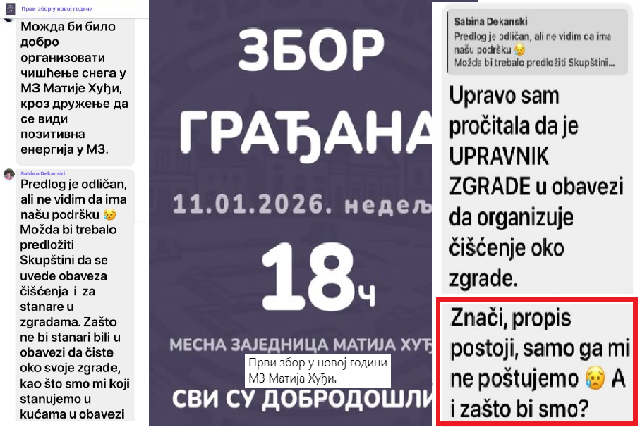 Kada se povelo pitanje ko će sneg čistiti ispred ulaza zgrada i kada je jedan od prisutnih napomenuo da su upravnici zgrada, u koordinaciji sa Savetom Mesne zajednice dužni, po zakonu, da organizuju čišćenje, dobijen je lakonski odgovor: “Znači, propis postoji samo ga mi ne poštujemo. A i zašto bismo?”