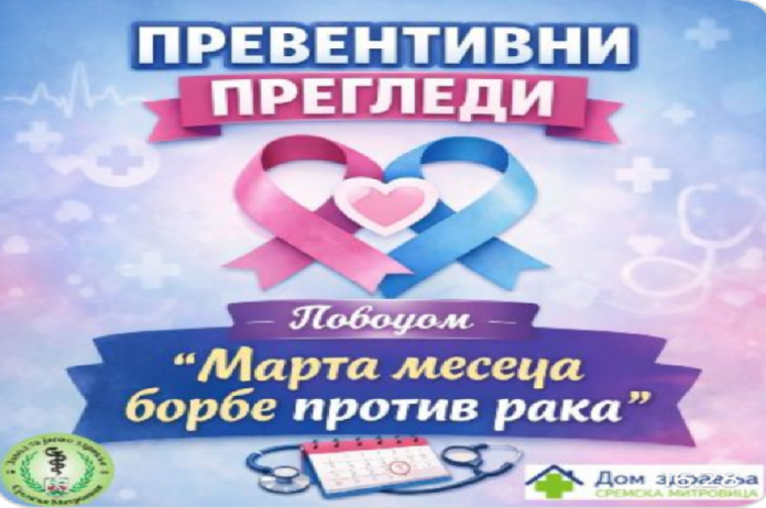 Zavod za javno zdravlje i Dom zdravlja Sremska Mitrovica pozivaju sugrađane na PREVENTIVNE PREGLEDE povodom „Marta meseca borbe protiv raka„, od 9 do 11 časova, koji će se održati u tri termina.