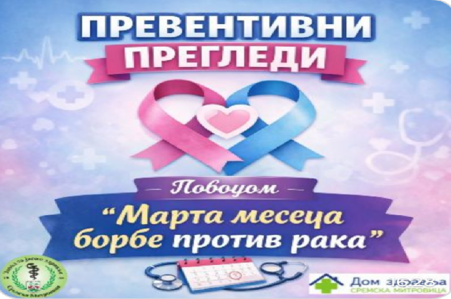 Zavod za javno zdravlje i Dom zdravlja Sremska Mitrovica pozivaju sugrađane na PREVENTIVNE PREGLEDE povodom „Marta meseca borbe protiv raka„, od 9 do 11 časova, koji će se održati u tri termina.