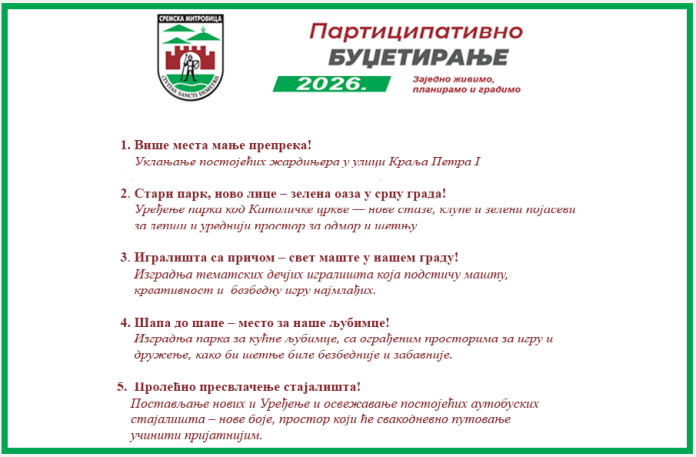 Projekat koji osvoji najviše glasova biće uvršten u Odluku o budžetu Grada Sremska Mitrovica za 2026. godinu, o kojoj će odlučivati odbornici Skupštine grada.