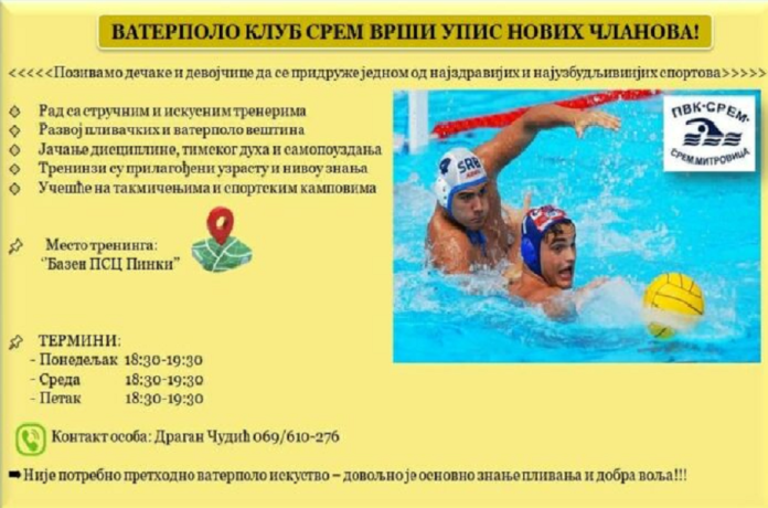Vaterpolo klub „Srem“ iz Sremske Mitrovice započeo je upis novih članova i poziva dečake i devojčice da se prijave. Treninzi se održavaju na bazenu u PSC „Pinki“, a namenjeni su deci različitog uzrasta, bez obzira na prethodno iskustvo u vaterpolu. Iz kluba poručuju da prethodno vaterpolo znanje nije uslov za upis – dovoljno je osnovno znanje plivanja i dobra volja. Treninzi su prilagođeni uzrastu i nivou znanja polaznika, a sa decom rade stručni i iskusni treneri.